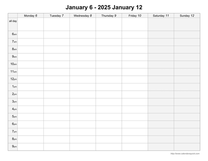This template lets you create printable weekly calendar pages with your chosen appointment time slot range (any time range between 12am and 11pm), an optional to do list on the side, and optional shaded weekends. Can include your schedule, special occasions, and holidays.