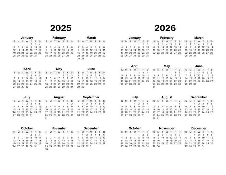 This template lets you create printable two-year calendar pages in Letter, A4, Legal, and Poster/Arch E paper sizes.