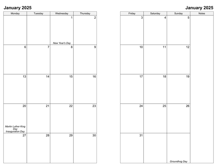 This template lets you create monthly calendars split across 2 pages with your schedule, events and holidays included (plus a column for notes). Print double-sided refills for your planner/organizer in Personal, Classic, Letter, and A4 paper sizes.