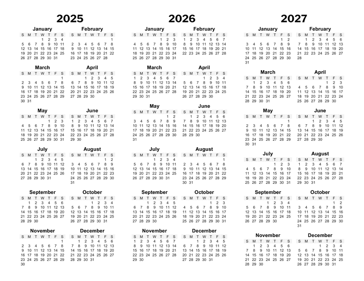 This template lets you create printable three-year calendar pages in Letter and A4 paper sizes.